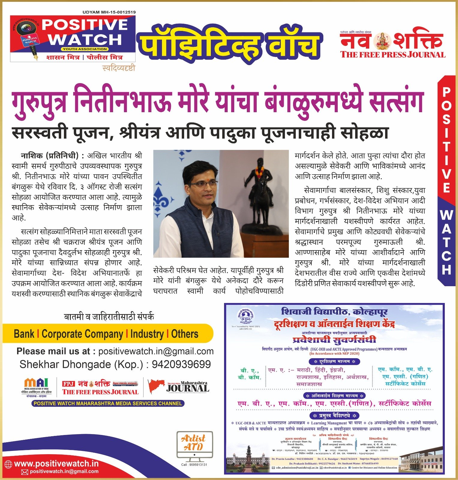गुरुपुत्र नितीनभाऊ मोरे यांचा ३ ऑगस्टला बंगळुरुमध्ये सत्संग..!