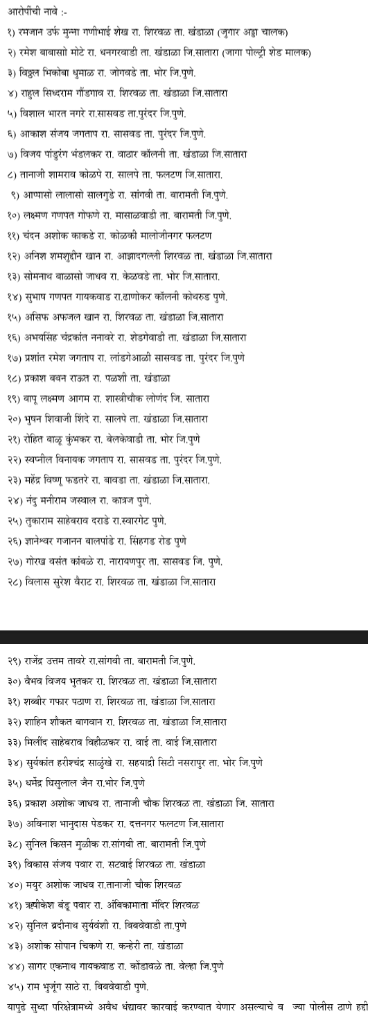 सातारा पोलिसांना गोपनिय विश्वसनीय बातमीदारामार्फत माहिती मिळाली नंतर, एक इसम तीन पानी पत्त्याचा जुगाराचा तसेच दारुचा अड्डा धनगरवाडी (ता. खंडाळा जि. सातारा) गावचे हद्दीतील डॉ. जगताप हॉस्पिटलचे पाठीमागे एका पोल्ट्री फार्मचे शेडमध्ये चालवित आहे, असे समजले. यानंतर सुनिल फुलारी (विशेष पोलीस महानिरीक्षक कोल्हापूर परिक्षेत्र कोल्हापूर) यांचे सूचनाप्रमाणे पोलीस अधिक्षक समीर शेख यांचे मार्गदर्शनाखाली त्यांनी स्वतः तसेच भुईंज पोलीस ठाणे व शिरवळ पोलीस ठाणेकडील अधिकारी व अंमलदार यांचे मदतीने माहितीच्या आधारे छापा टाकला असता तेथे एकूण ४३ इसम जुगार खेळत असल्याचे दिसून आले.त्यांना ताब्यात घेवून नमुद इसमांचेकडून रोख रक्कम, जुगार साहित्य, विदेशी दारु, बीअर, मोबाईल हेन्डसेट तसेच ६ चारचाकी वाहने व १४ दुचाकी चाहने असा एकूण १,०९,२०,०३० रुपये किमतीचे मुद्देमाल जप्त करण्यात आला असून नमुद इसमांचेविरुध्द तसेच जुगार अड्डा चालविणारे इसमाचे विरुध्द शिरवळ पोलीस ठाण्यास गुन्हा नोंद करण्यात आलेला आहे.या यशस्वी कामगिरी नंतर सुनील फुलारी यांनी सर्व अधिकारी, पथक यांच्या कामगिरीवर शाबासकीची थाप मारली.