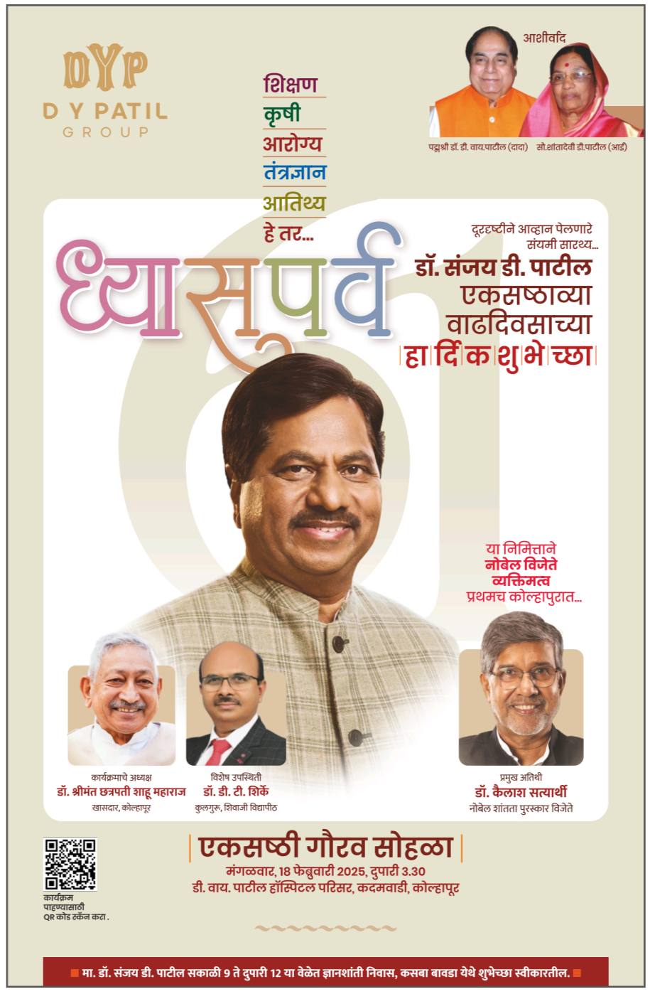 कोल्हापूर – शिक्षण क्षेत्रात बहुमूल्य योगदान देणारे डी. वाय. पाटील ग्रुपचे अध्यक्ष तथा कुलपती डॉ. संजय डी. पाटील यांचा एकसष्ठी सोहळा आज मंगळवार दि. १८ फेब्रुवारी रोजी साजरा होत आहे. खासदार डॉ. श्रीमंत छत्रपती शाहू महाराज यांच्या अध्यक्षतेखाली आणि पद्मश्री डॉ. डी. वाय. पाटील (दादासाहेब) यांच्या आशीर्वादाने होणाऱ्या या समारंभाला नोबेल शांतता पुरस्कार विजेते डॉ. कैलास सत्यार्थी हे प्रमुख अतिथी म्हणून उपस्थित राहणार आहे.