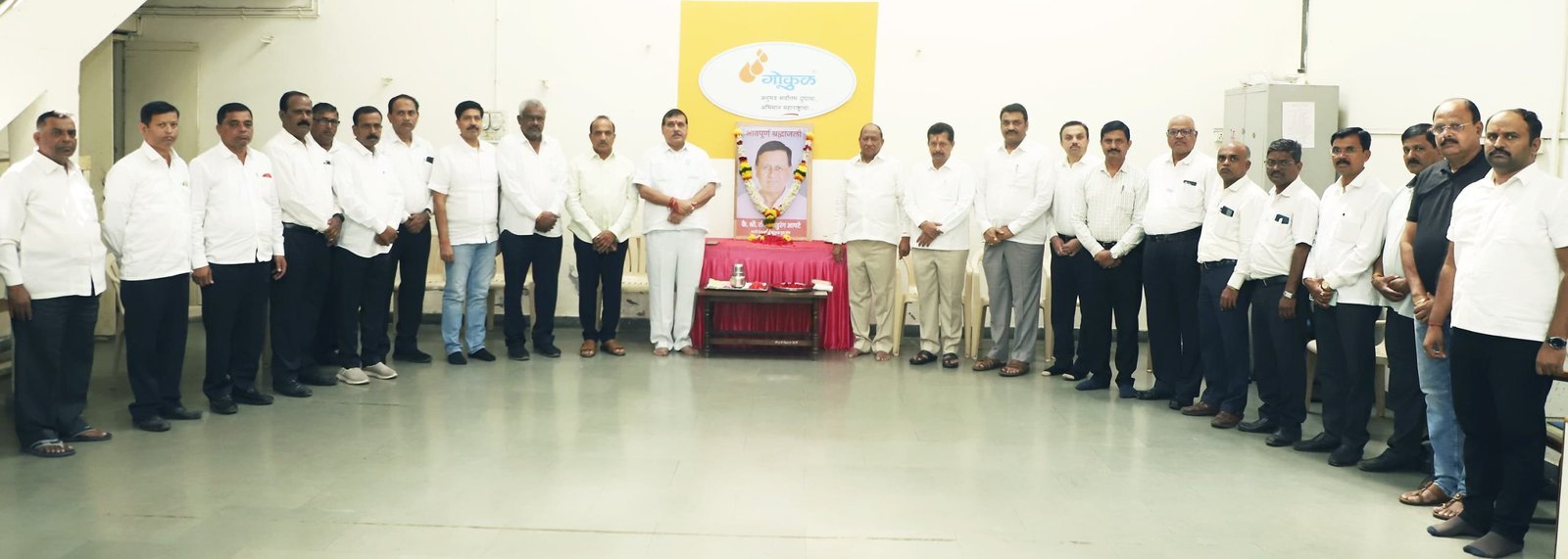 गोकुळच्या ताराबाई पार्क कार्यालय येथे स्व.रविंद्र आपटे यांना श्रद्धांजली वाहताना संघाचे चेअरमन अरुण डोंगळे, ज्येष्ठ संचालक विश्वास पाटील, संचालक अजित नरके, शशिकांत पाटील–चुयेकर, संभाजी पाटील संघाचे अधिकारी व कर्मचारी दिसत आहेत.