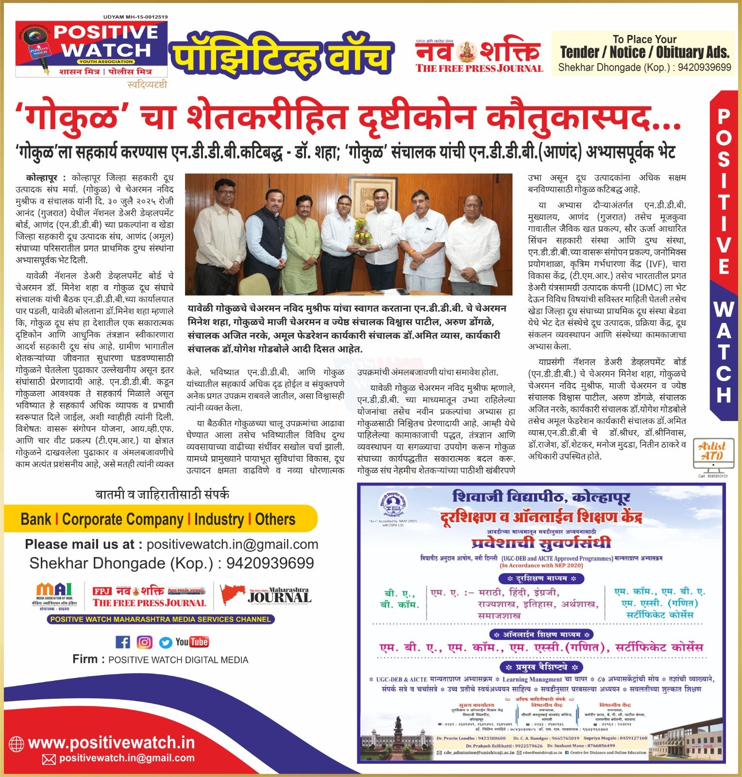 कोल्हापूर: कोल्हापूर जिल्हा सहकारी दूध उत्पादक संघ मर्यादित (गोकुळ) चे चेअरमन नविद मुश्रीफ व संचालक मंडळाने ३० जुलै २०२५ रोजी गुजरातमधील नॅशनल डेअरी डेव्हलपमेंट बोर्ड (एन.डी.डी.बी.), आणंद व ‘अमूल’ संघाच्या कार्यपद्धतीचा सखोल अभ्यास करण्यासाठी विशेष दौरा केला.