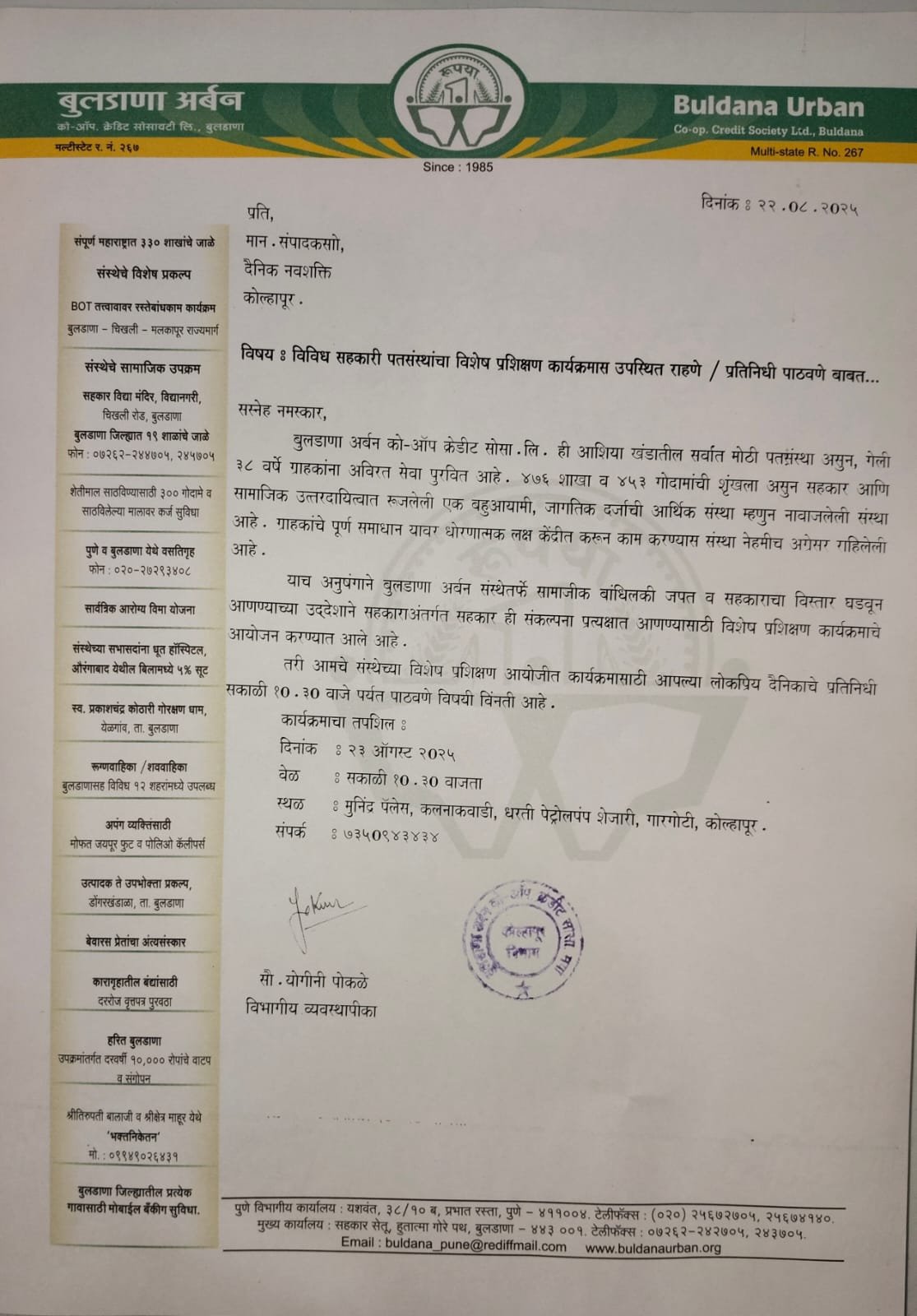 विभागीय व्यवस्थापक श्रीमती योगिनी पोकळे यांनी सांगितले की,