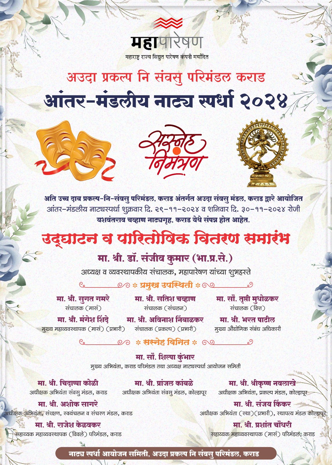 महापारेषण मधील सर्वच कर्मचारी हे वर्षाचे 365 दिवस वीज पुरवठा सुरळीत राहावा यासाठी नियमित काम करत असतात. कोरोना मध्ये सुद्धा आपल्या जीवाची परवा न करता या कर्मचाऱ्यांनी अहोरात्र मेहनत घेऊन काम केले. याच कर्मचाऱ्यांमधील अनेक कलागुणांना वाव मिळावी यासाठी दरवर्षी महापारेषण विविध कार्यक्रमांचे आयोजन करत असते. त्याच कार्यक्रमाचा एक भाग म्हणून यावर्षी नाट्य स्पर्धा कराड येथे आयोजित करण्यात आली आहे. या नाट्य स्पर्धेसाठी सातारा, कोल्हापूर, सांगली, रत्नागिरी, सिंधुदुर्ग या पाच जिल्ह्यातून महापारेषणचे कर्मचारी आणि अधिकारी सहभागी होणार आहेत.