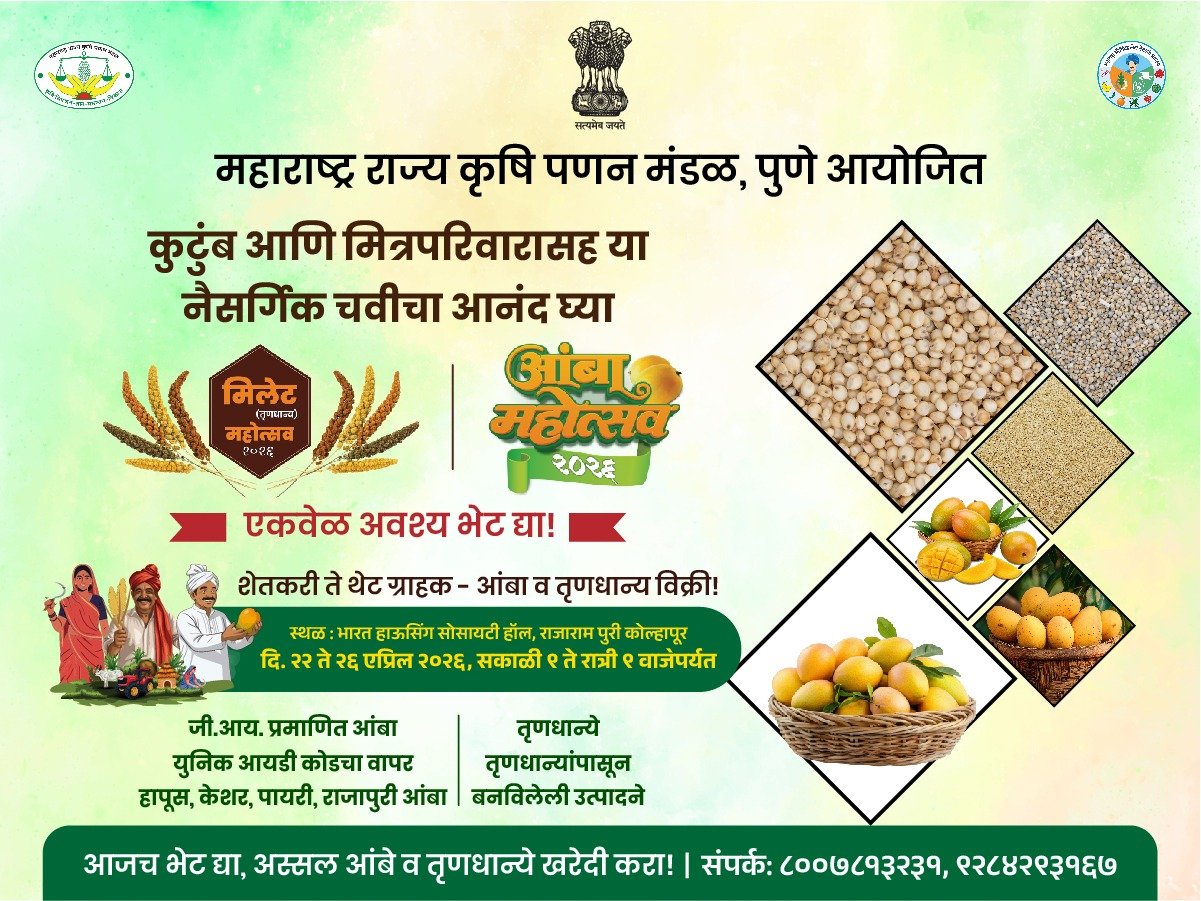 काेल्हापूरः TEAM WATCH — कृषी पणन मंडळामार्फत कोल्हापूर शहरात आयोजित करण्यात आलेला मिलेट व फळ महोत्सव २०२६ हा केवळ विक्रीचा उपक्रम नसून शेतकरी आणि ग्राहक यांच्यातील थेट नातेसंबंध अधिक दृढ करणारा, आरोग्यदायी आहाराची जाणीव करून देणारा आणि कोल्हापूरच्या समृद्ध खाद्यसंस्कृतीला नवा आयाम देणारा उपक्रम ठरत आहे. ‘उत्पादक ते ग्राहक थेट विक्री’ या संकल्पनेवर आधारित हा महोत्सव २२ ते २६ एप्रिल २०२६ दरम्यान राजारामपुरी येथील भारत हाऊसिंग सोसायटी हॉल येथे रंगणार असून, कोल्हापूरकरांसाठी ही एक आगळीवेगळी खाद्यपर्वणी ठरणार आहे. राज्यातील विविध भागांतील शेतकऱ्यांनी उत्पादित केलेले मिलेट्स, त्यापासून तयार विविध पदार्थ तसेच आंबा, डाळिंब, स्ट्रॉबेरी, अंजीर, पेरू यांसारख्या फळांची थेट विक्री या महोत्सवात होणार आहे. त्यामुळे ग्राहकांना ताजे, दर्जेदार आणि परवडणाऱ्या दरातील उत्पादने मिळणार असून शेतकऱ्यांना थेट बाजारपेठ उपलब्ध होणार आहे. महोत्सवाचे उद्घाटन बुधवार, २२ एप्रिल २०२६ रोजी सायंकाळी ४ वाजता कोल्हापूर महानगरपालिकेचे आयुक्त डॉ. राजेंद्र भारूड यांच्या हस्ते होणार आहे. याप्रसंगी सुनील फुलारी (भा.पो.से.), विशेष पोलीस महानिरीक्षक, कोल्हापूर परिक्षेत्र तसेच डॉ. जस्मिन मॅडम (भा. प्र. से.), मुख्य कार्यकारी अधिकारी, जिल्हा परिषद कोल्हापूर उपस्थित राहणार आहेत. याशिवाय कृषी उत्पन्न मंडळाचे कार्यकारी संचालक संजय कदम, सरव्यवस्थापक विनायक कोकरे, विभागीय सहनिबंधक महेश कदम, विभागीय कृषी सहसंचालक बसवराज मास्तोळी, जिल्हा उप निबंधक नीलकंठ करे, जिल्हा कृषी अधिकारी जालिंदर पांगारे आदी मान्यवरांची उपस्थिती राहणार आहे. सकाळी ९ ते रात्री ९ या वेळेत सुरू असणाऱ्या या महोत्सवात विविध तृणधान्ये, त्यांचे पदार्थ आणि फळांची आकर्षक मांडणी पाहायला मिळणार आहे. यासोबतच आरोग्यदायी आहाराचे महत्त्व पटवून देण्यासाठी डॉ. सदिप पाटील, डॉ. अहिल्या वाघमोडे, डॉ. योगेस बन आणि डॉ. प्रतिभा थोंबरे या आहारतज्ञांची मार्गदर्शक व्याख्याने आयोजित करण्यात आली आहेत. महिलांसाठी मिलेट्सवर आधारित पाककृती स्पर्धा हेही महोत्सवाचे विशेष आकर्षण ठरणार असून पारंपरिक धान्यांचा वापर वाढवण्याचा प्रयत्न या माध्यमातून केला जात आहे. तसेच रायपूर (छत्तीसगढ) येथील मिलेट आहारतज्ञ कृष्ण मोहन यांचे २६ एप्रिल रोजी सायंकाळी ६ ते ८ या वेळेत मिलेट पदार्थ तयार करण्याबाबत प्रबोधनपर सत्र आयोजित करण्यात आले आहे. ही बातमीही जास्त वाचली गेली.. पहा लिंक “शेतकऱ्यांच्या गरजांना न्याय देणाऱ्या बाजार समित्यांची गरज”- सुभाष घुले