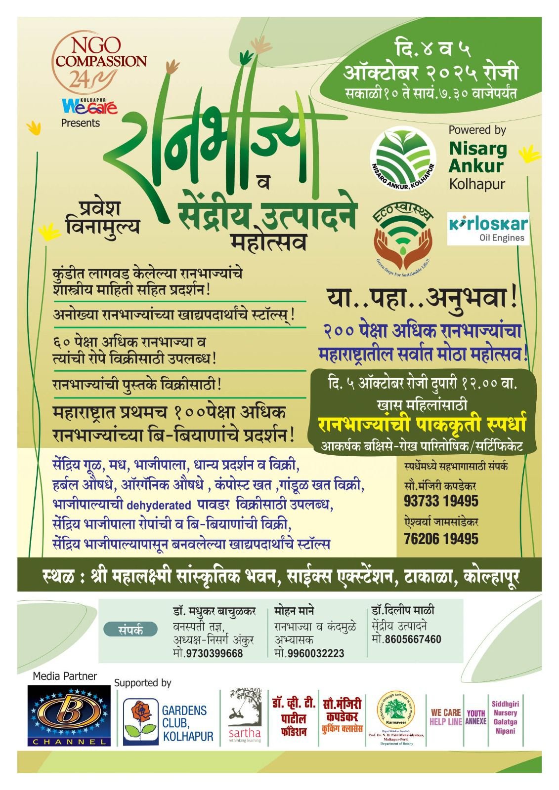 सह्याद्री डोंगररांगा ,कोकण आणि विशेषतः पश्चिम महाराष्ट्रातील अत्यंत दुर्गम भागात, जंगलात नैसर्गिकरित्या उगवणाऱ्या आणि सहजगत्या उपलब्ध होणाऱ्या आरोग्यदायी, पौष्टिक व औषधी अशा रानभाज्यांची ओळख सर्वांना होऊन, त्यांचा वापर आहारात करावा,निसर्गप्रेमींंनी या रानभाज्या आपल्या परसबागेत लावाव्यात, तसेच शेतकऱ्यांनी महत्वाच्या दुर्मिळ रानभाज्यांची शेतात लागवड करुन त्यांचे फायदे मिळवावेत ह्यादृष्टीने एनजीओ कंपॅशन २४,कोल्हापूर वुई केअर आणि निसर्ग अंकुर ह्यांच्यावतीने जवळपास २०० हुन अधिक रानभाज्यांचे आणि सेंद्रिय उत्पादनांचे माहितीपूर्ण प्रदर्शन येत्या शनिवारी आणि रविवारी ४ आणि ५ ऑक्टोंबर २०२५ रोजी श्री महालक्ष्मी सांस्कृतिक भवन, साईक्स एक्सटेंशन टाकाळा, कोल्हापूर येथे सकाळी १० ते रात्री ८ ह्या वेळेत आयोजित करण्यात आले आहे,अशी माहिती एनजीओ कंपेंशन २४ आणि कोल्हापूर वुई केअरचे अध्यक्ष मिलिंद धोंड यांनी पत्रकारांशी बोलताना दिली.