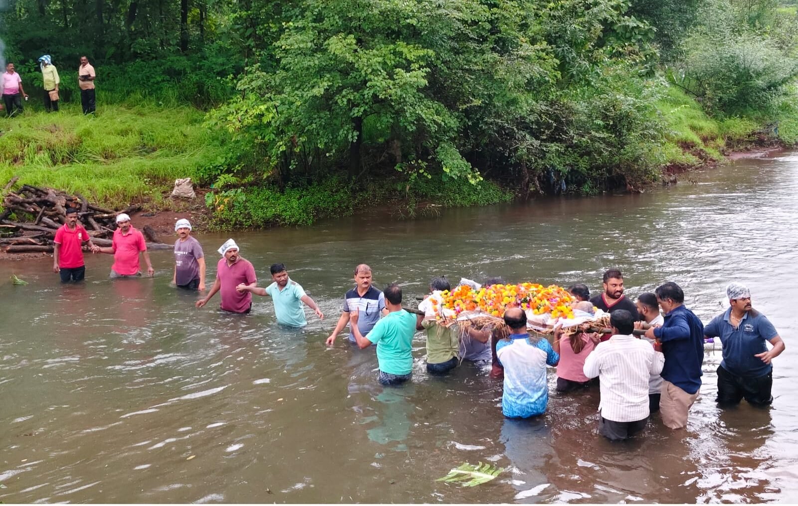 गेल्या ७० वर्षांपासून नदीपलीकडे असलेल्या स्मशानभूमीकडे जाण्यासाठी ना रस्ता, ना पूल — केवळ जीवनाला धोका पत्करून, मानवी साखळी करून नदी पार.