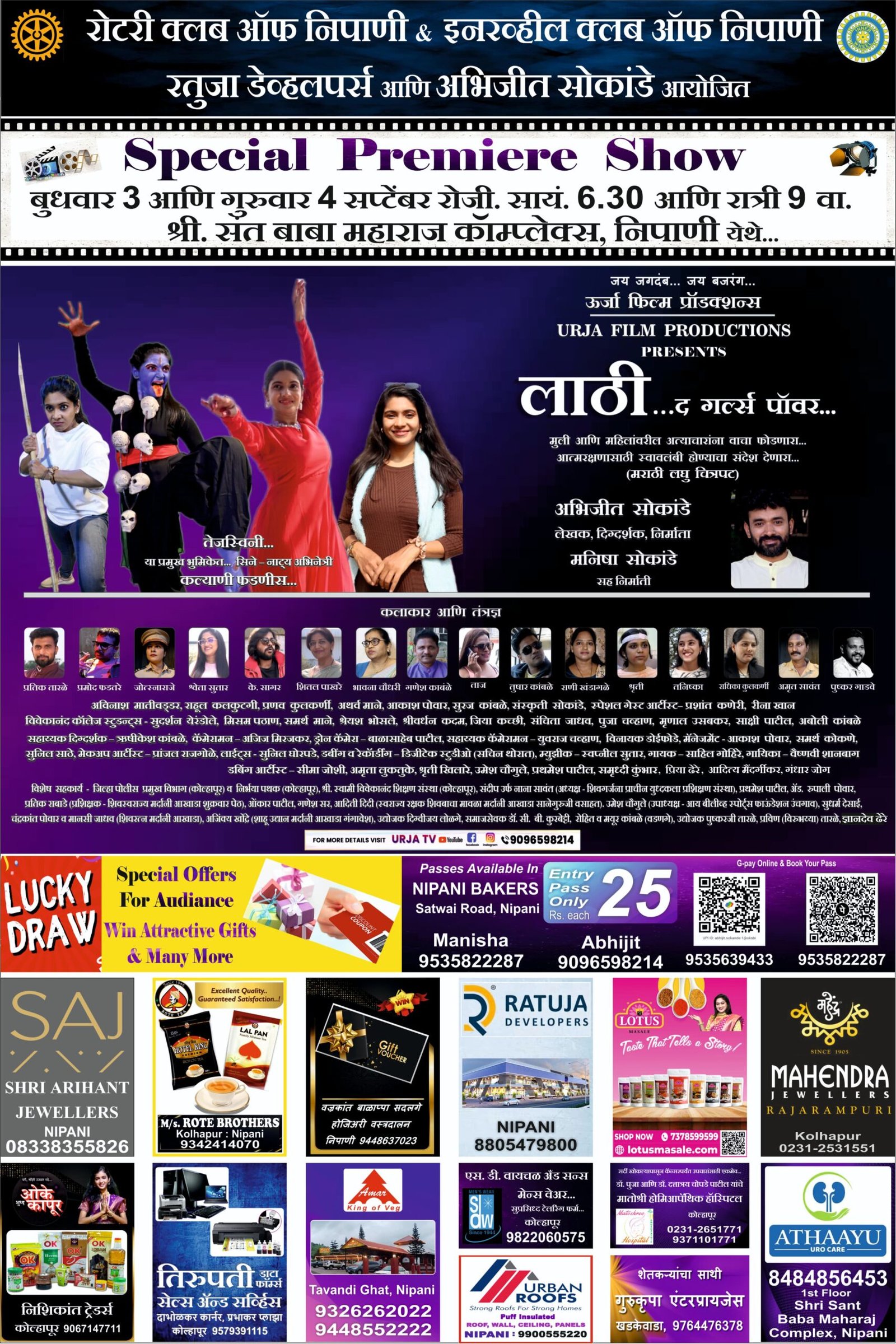 निपाणी -(अवधूत काेरडे)ः गणेशोत्सवाच्या पार्श्वभूमीवर निपाणीकरांसाठी खास “लाठी… द गर्ल्स पॉवर” या लघुपटाचा स्पेशल प्रीमियर शो आयोजित करण्यात आला आहे. बुधवार ३ आणि गुरुवार ४ सप्टेंबर रोजी संध्याकाळी ६.३० वाजता व रात्री ९ वाजता, श्री संत बाबा महाराज कॉम्प्लेक्स येथे हा शो होणार आहे. मुलींच्या आत्मसंरक्षणाचा संदेश देणारा हा चित्रपट सर्वांनी अवश्य पाहावा, असे आवाहन निर्माते-दिग्दर्शक अभिजीत सोकांडे यांनी केले आहे.
